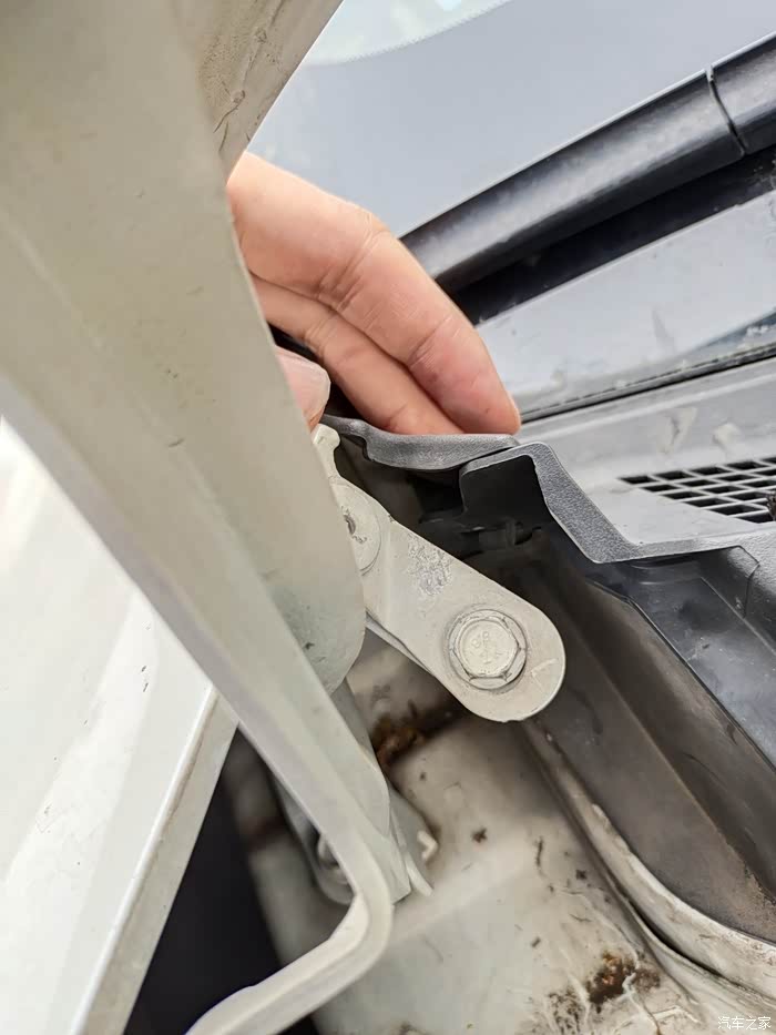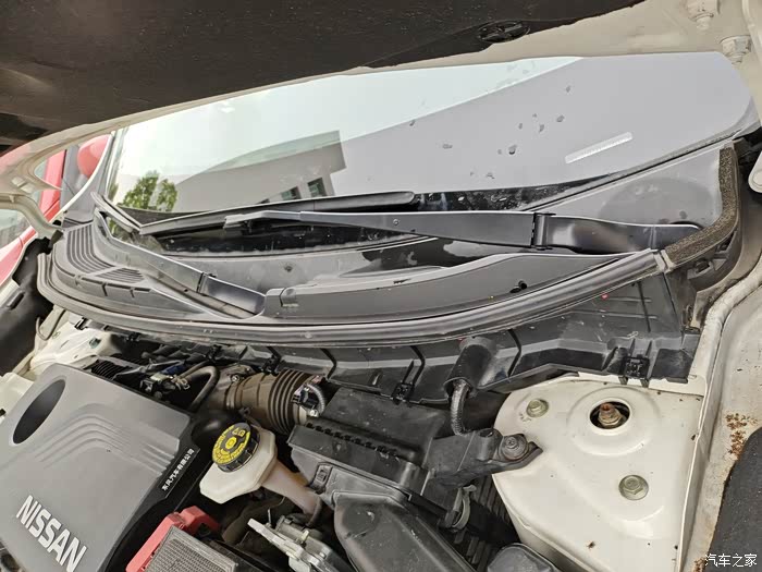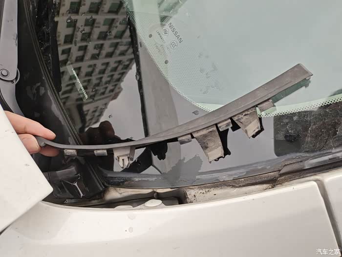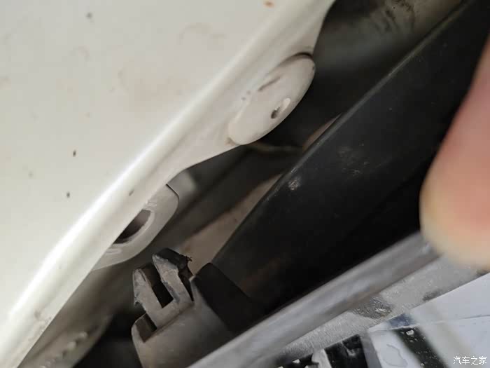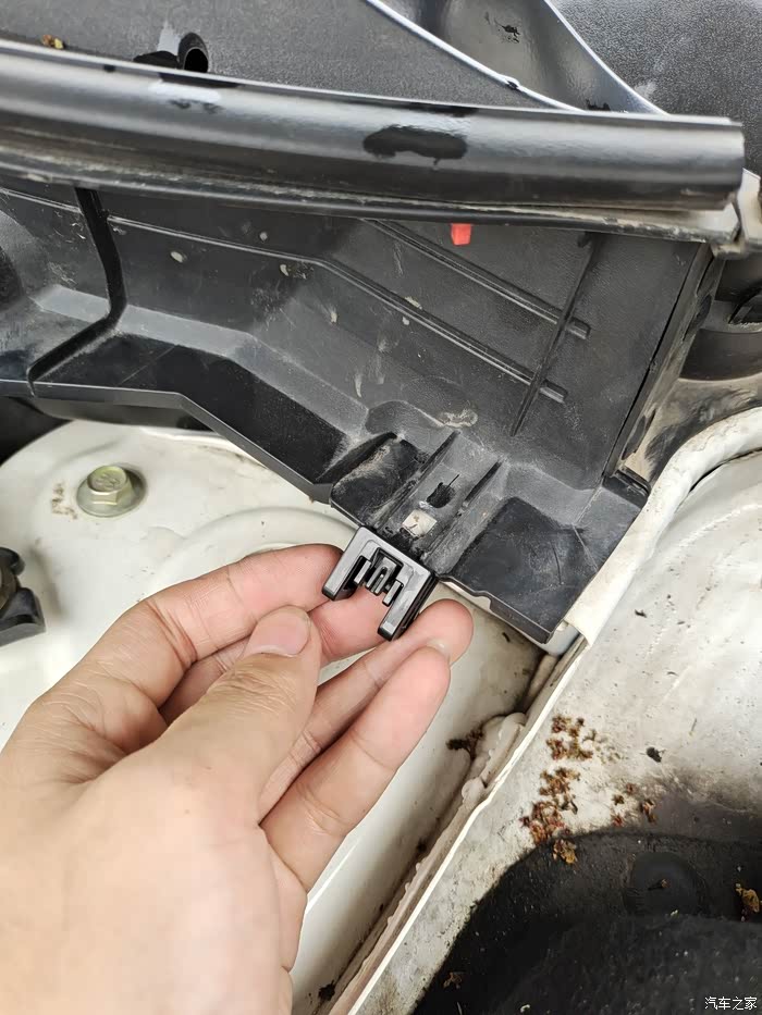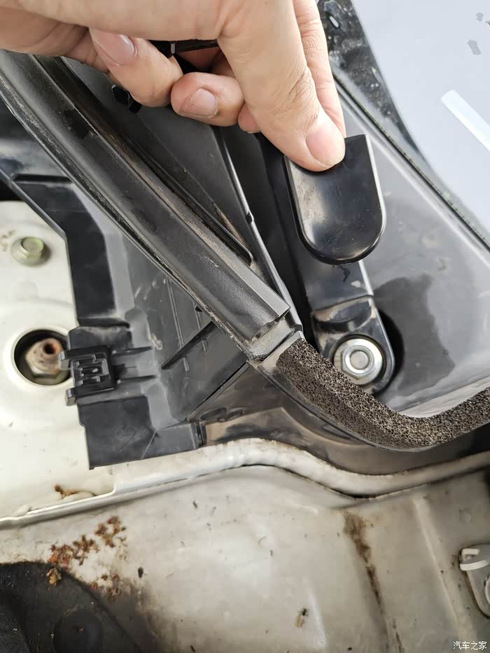 第18步,顶罩板拆卸后,可以此时可以看到出水口的位置,顺便可以对雨刮臂的槽底清洁一下。