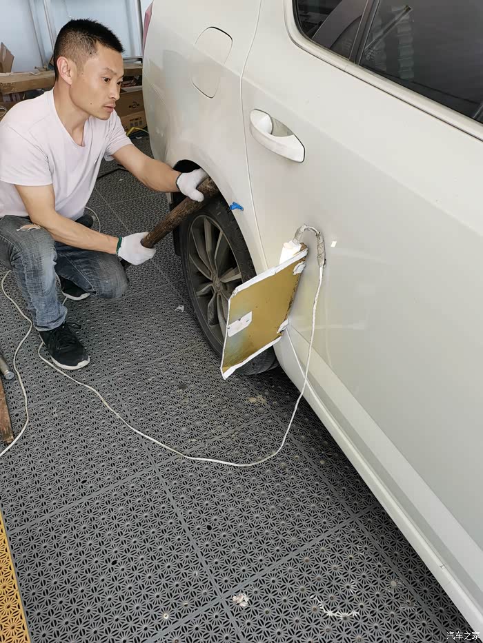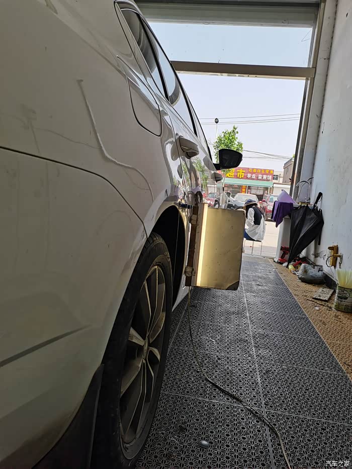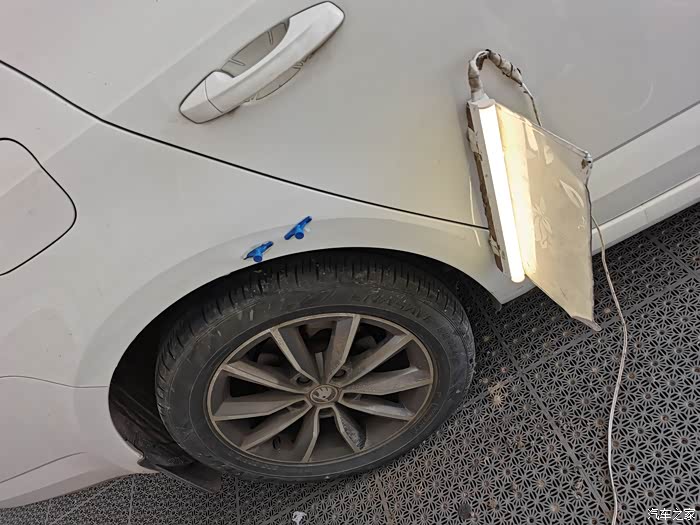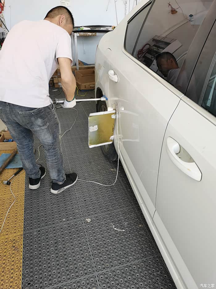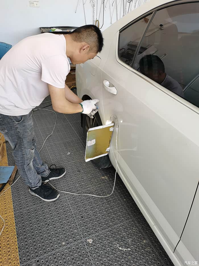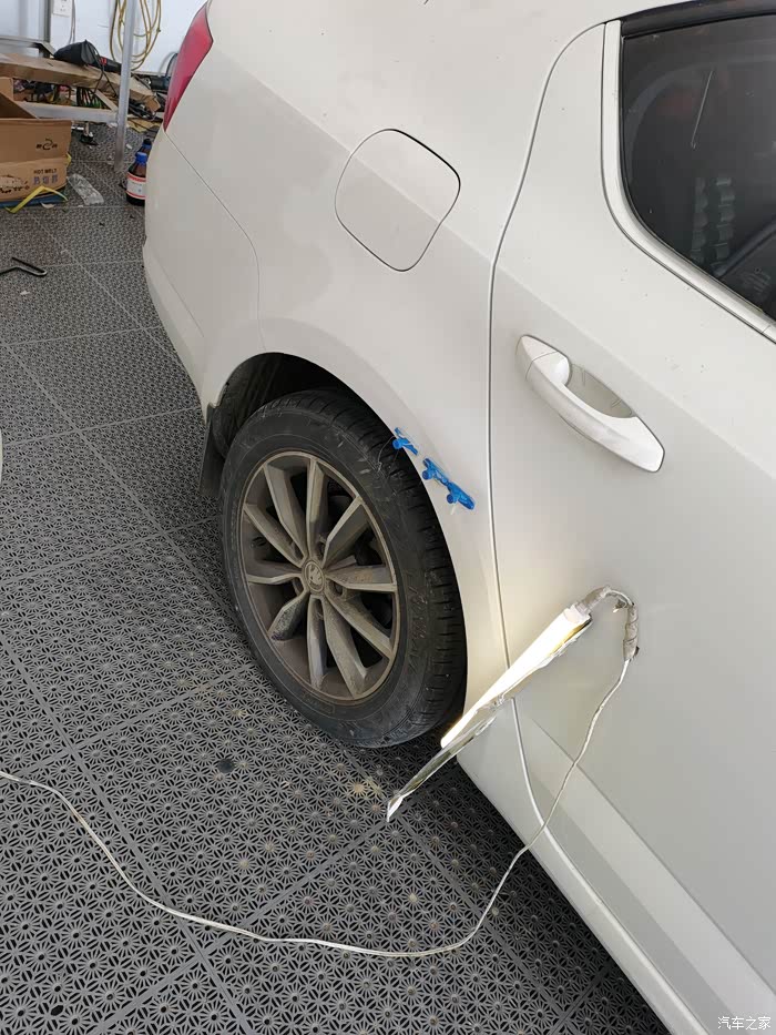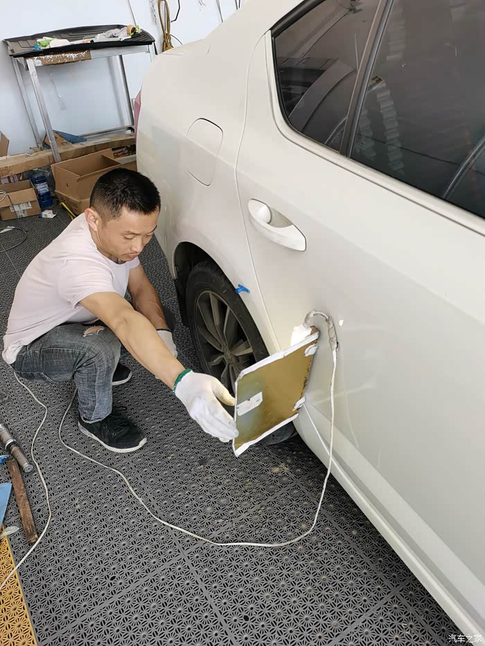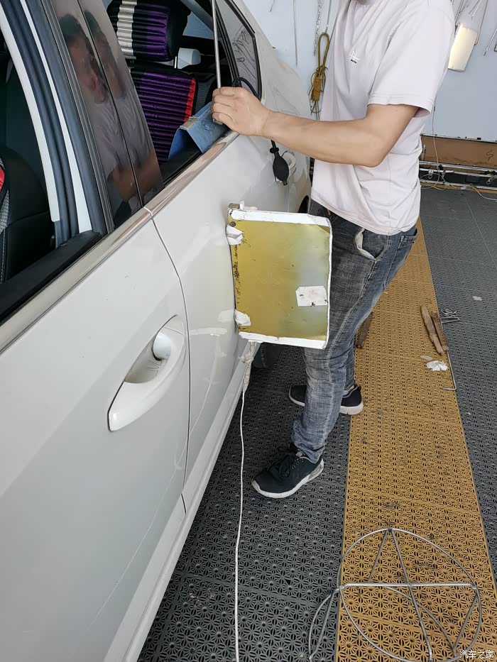 后翼子板已经进去了,唉,这种部位是最不容易修复的,钣金吧,时间久了肯定会锈,而且过个几年会发黄。仔细观察了下,没掉漆,只是别人的漆粘我漆面上了。然后就想着免喷漆凹痕修复下能不能行。我们这有规模比较大的二手车批发市场,周围全部都是配套产业,就在这里找到了一个专业免喷漆修复的,听别人说他修复的不错,那就整。