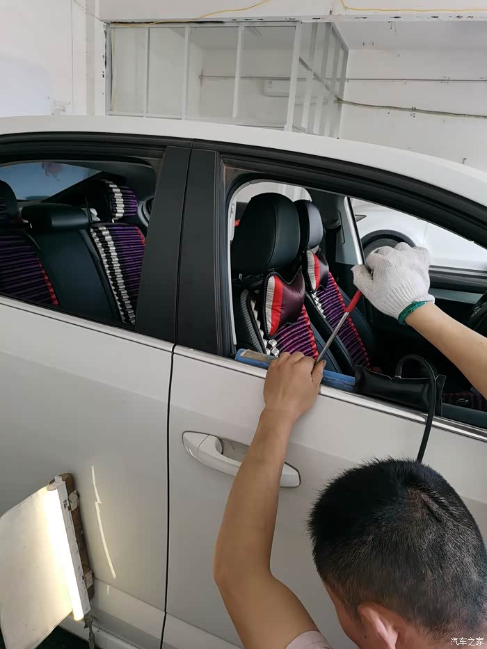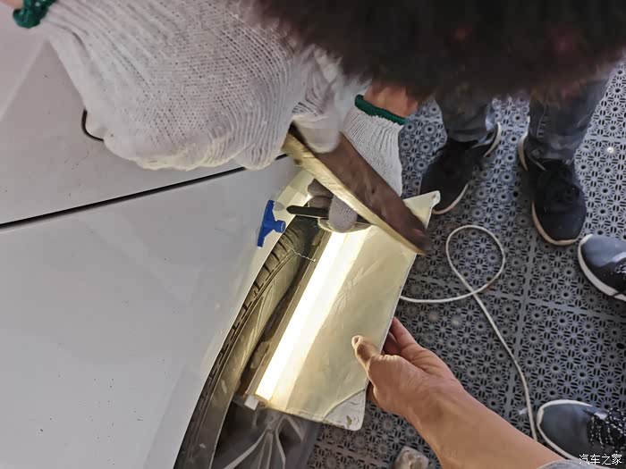 用灯光找平,门板用一个充气装置撑开,工具从撑开的地方进入,开始修复