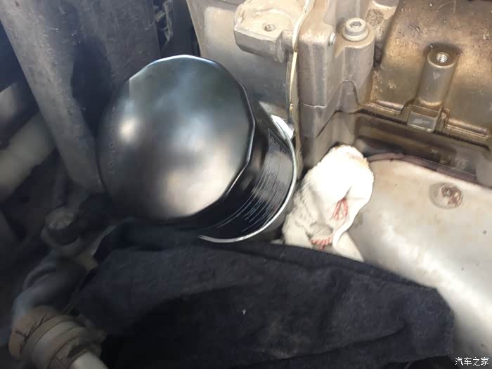 给机滤的下面垫了一块布,防止旧机油泄露到车内。