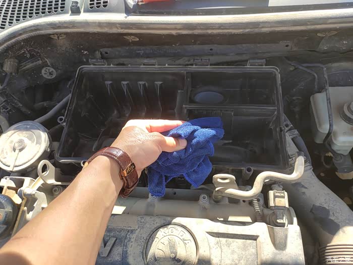 顺便把空气滤芯的的盒子用干净毛斤擦拭干净,里面会有尘土