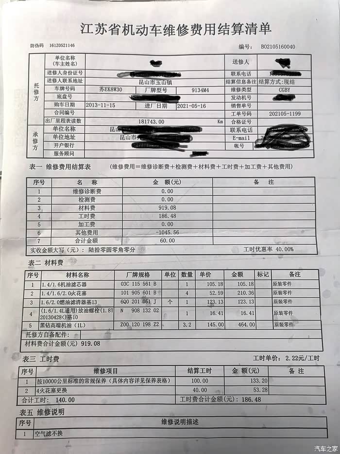 这是本次老明大保健的费用清单,工时费一直都是6折……