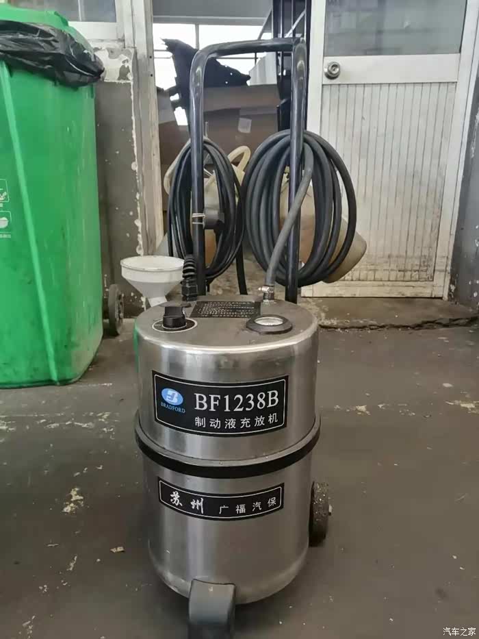打开充放机,新刹车油泵入刹车油壶,在充放机压力下从后轮放油嘴流入旧油回收壶。
