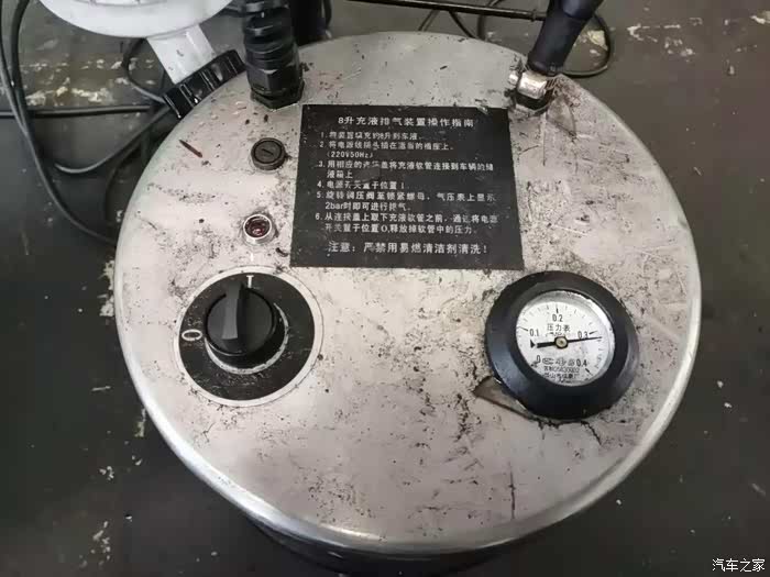 师傅把充放机加油管接到刹车油壶口上。