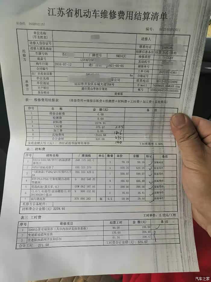 结算单,工时免费,以前送的代金券抵扣150元。机油机滤保险公司送的。实际支付变数箱材料费