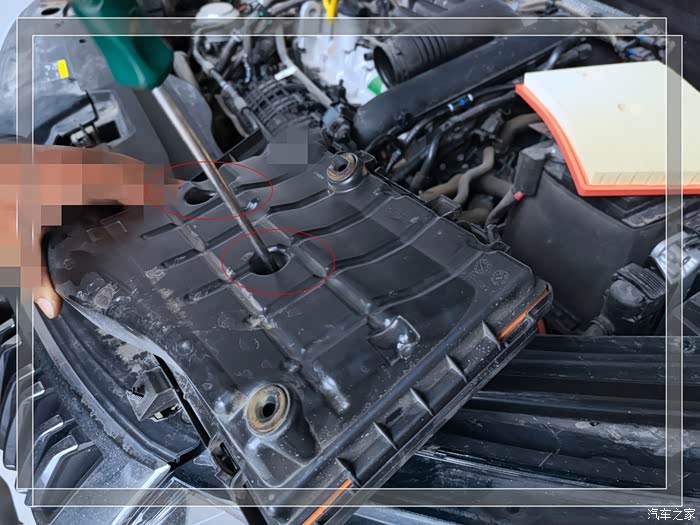 需要注意的是要将整个放滤芯的盒子取下来,下面有两个螺丝,要不你在上面打不开,有点麻烦,我标注的这三个地方,需要拆卸。