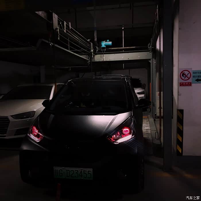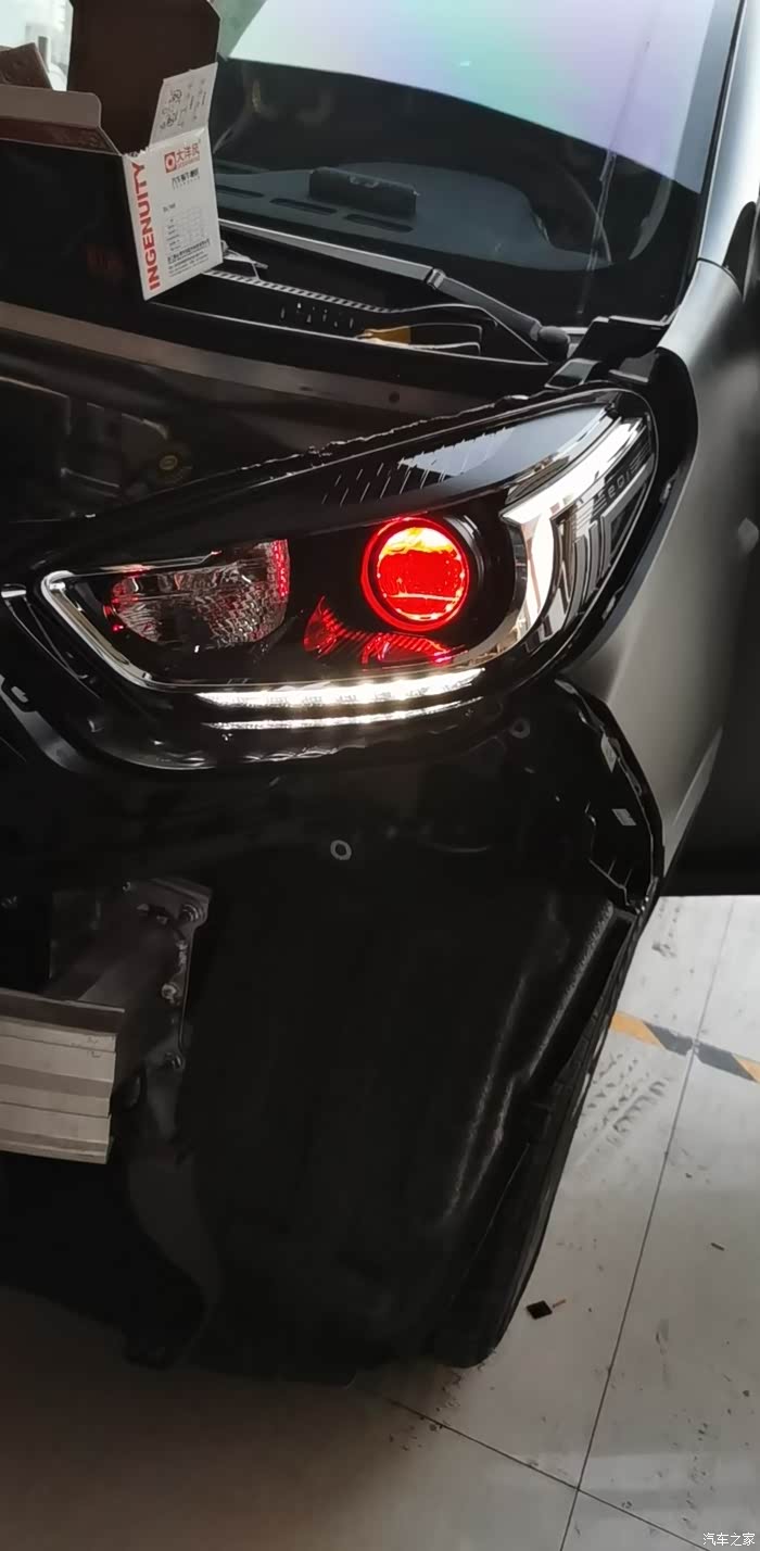 ,那身子都这么帅了,做为灵魂之窗的车灯,怎么能不修饰一下呢[害羞,既然选择的是走酷酷路线大灯必须要搞一搞,本来想着天使眼恶魔眼能上的都上,结果构思了一下,小蚂蚁的原厂日行灯再配个天使眼日行灯不太好看,过段去掉了天使眼选项,留下单恶魔眼的配置,红色,第一个浮现脑子的颜色,具备战斗气息,搭配全黑的外观,原本就熏黑的灯箱,想想都觉得很酷,经过改灯师傅三天的不懈努力(小蚂蚁灯罩实属结实),证明个人的选择还是很正确的,改灯期间事情太多,照片不多,放几张成品照将就看看