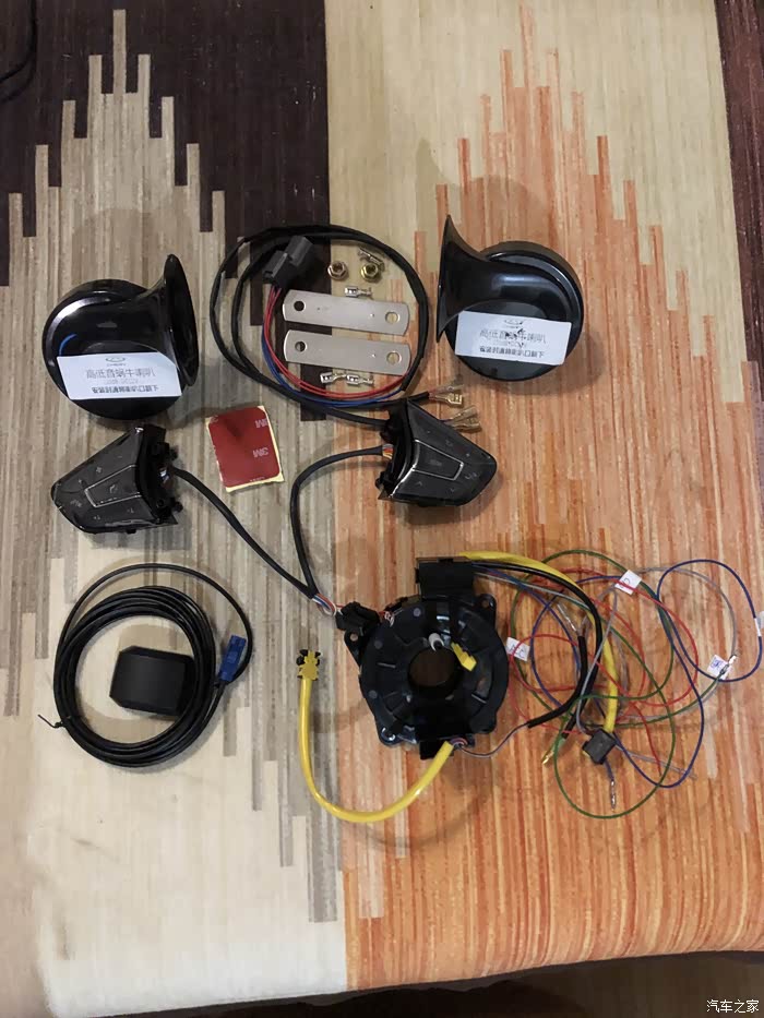 2.蜗牛喇叭,原车的电喇叭我估计和电动自行车上面的型号差不多,在车流中按喇叭就像卖萌,果断换成蜗牛喇叭。3,多功能方向盘按键,这个工程量最大,在前两项单独完成后才敢搞这个,中途大屏卡子断了几个,换上备用的,其他无恙。