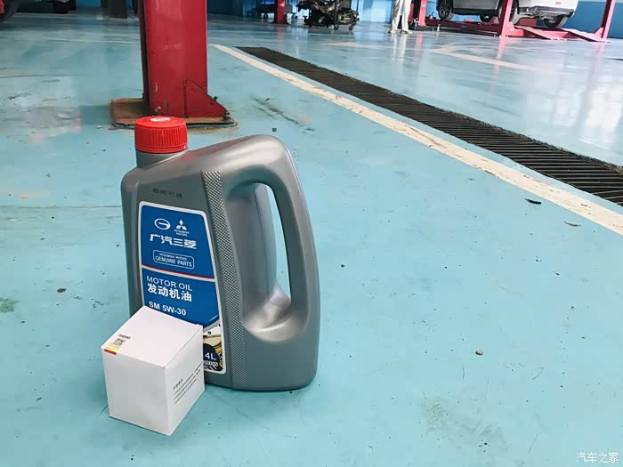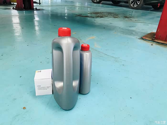 师傅拿来了5L机油,一个滤芯。我说1L的机油我直接拿回家,这次不用。