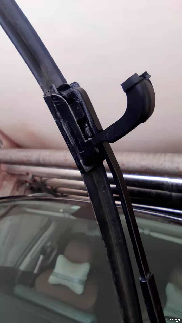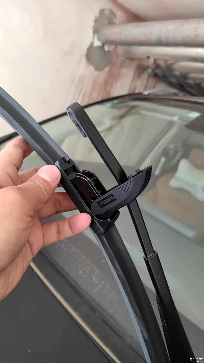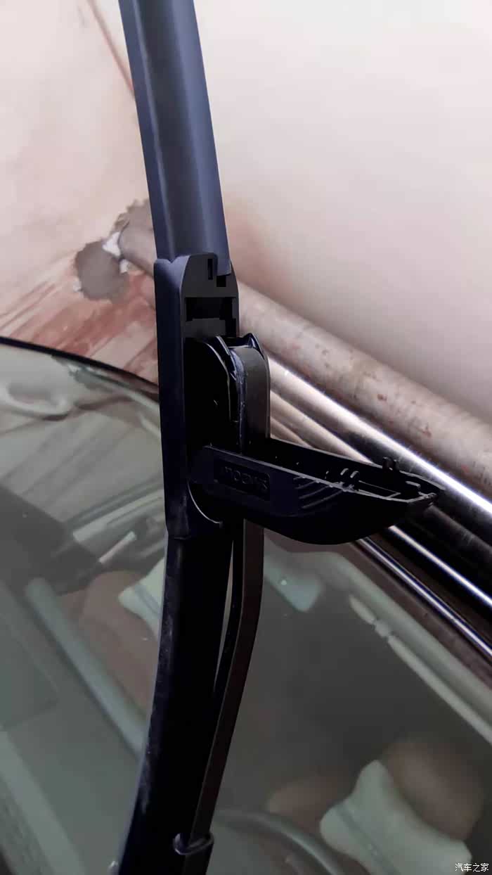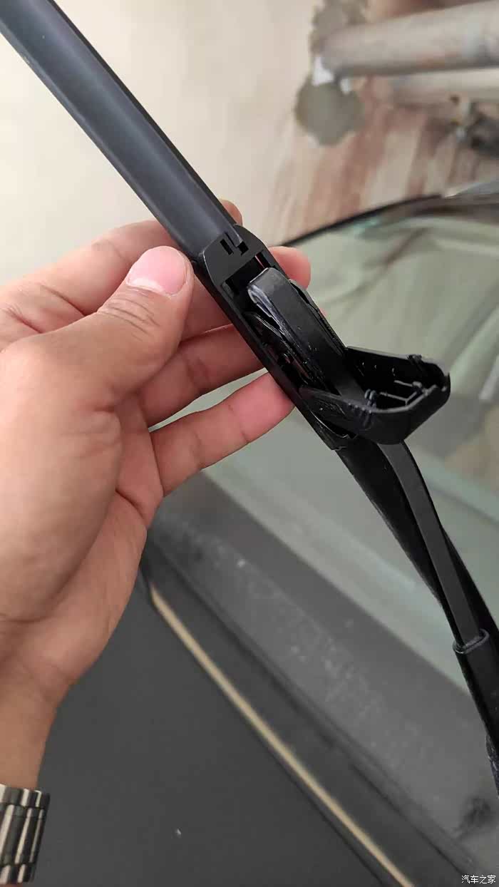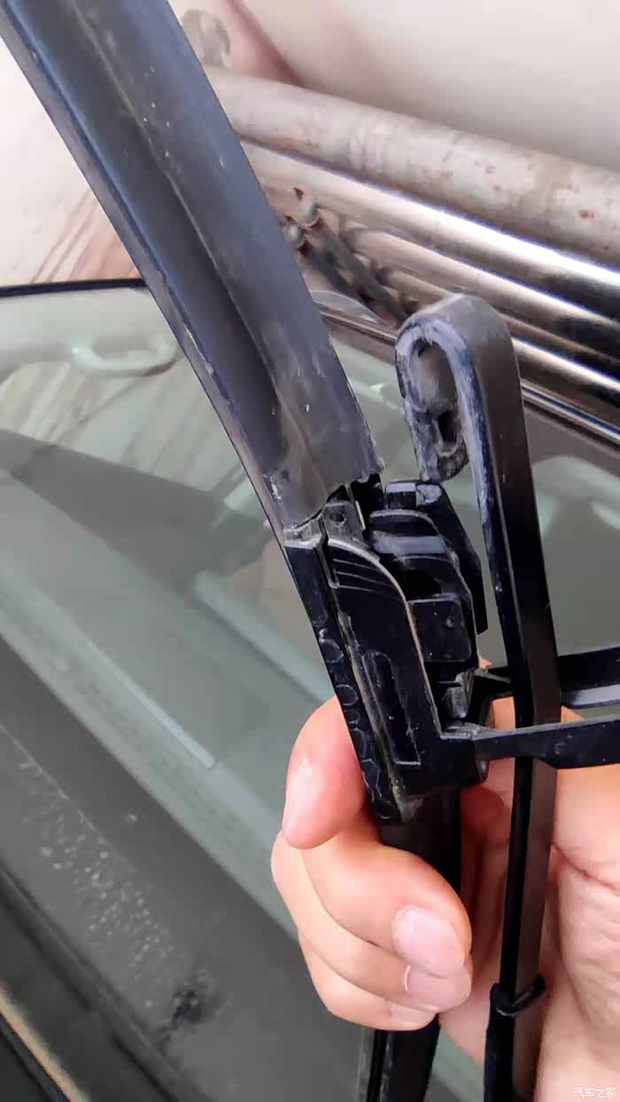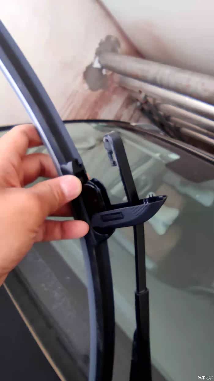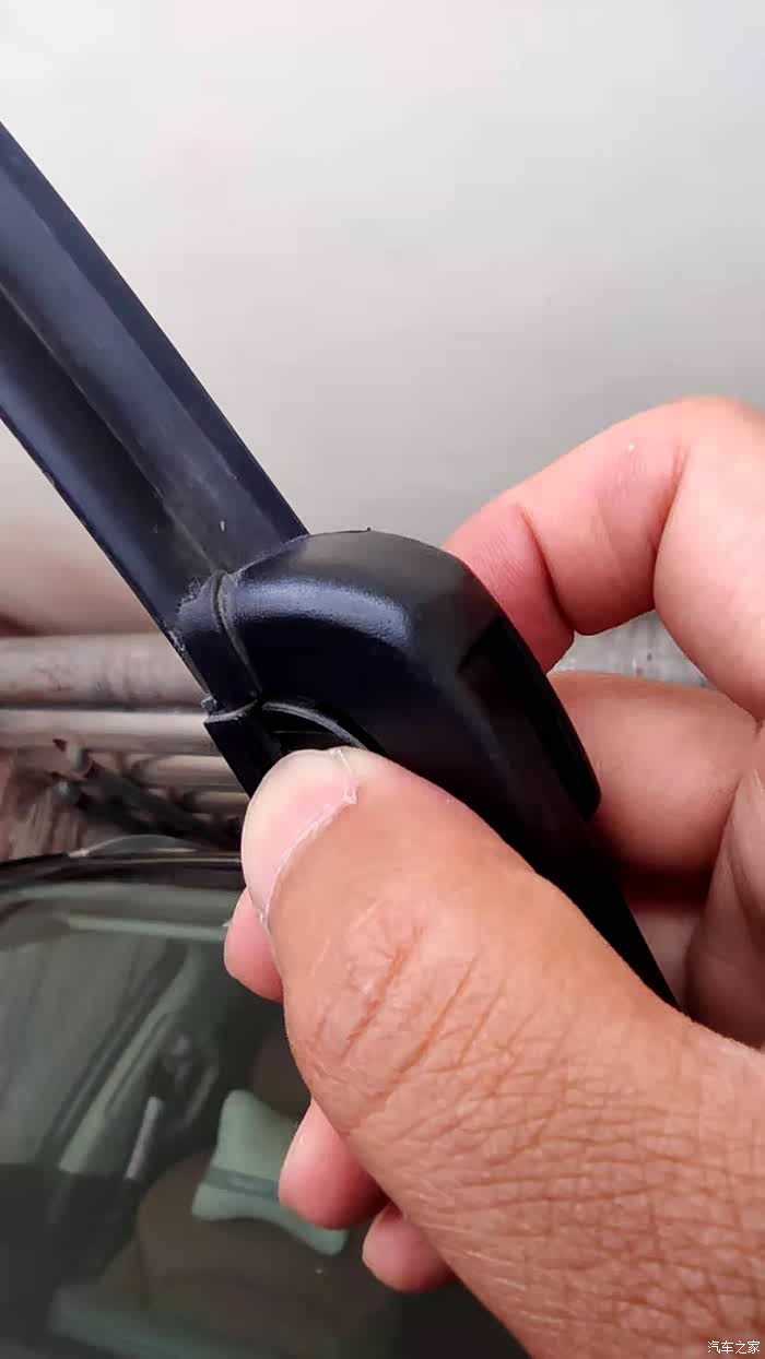 然后把新雨刮固定在固定端的钩子上,稍微用力拉到位。