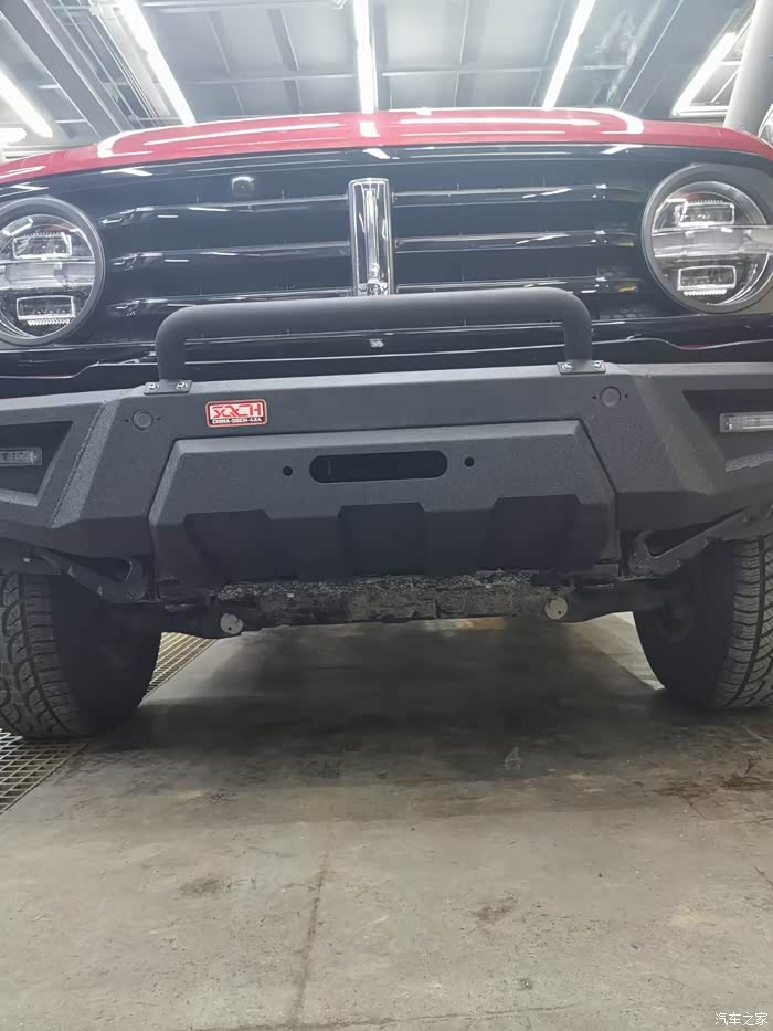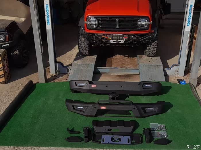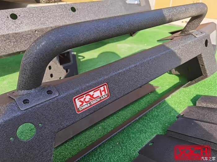 前杠走起!对于经常出去野的小伙伴来说,竞技前杠这基本上算是标配的必改项目了,毕竟原车前杠强度和防护性上肯定是不如竞技杠的。注意竞技杠材质尽量选择轻一点的!不然刹车的时候容易“点头”