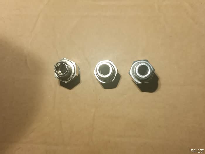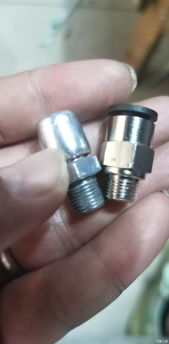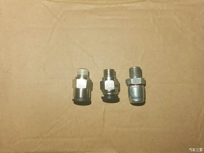 因为市场买表匹配原车孔位的接头,我朋友为我定制了替换ARB带的软管接头,丝扣数据是匹配原车孔位的,左边是ARB带的,中间是定制的,右边是原车透气阀体。
