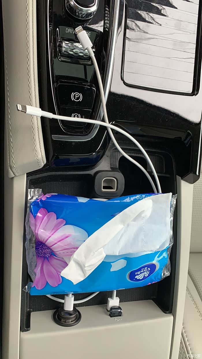 所以我就插了俩线,一根USB-Lightning 用于车载Carplay连接,一根点烟器口的PD快充线,充电非常快,然后就是袖珍U盘,以及一包轻薄的餐巾纸,这样空间利用率就提高了许多,完美!