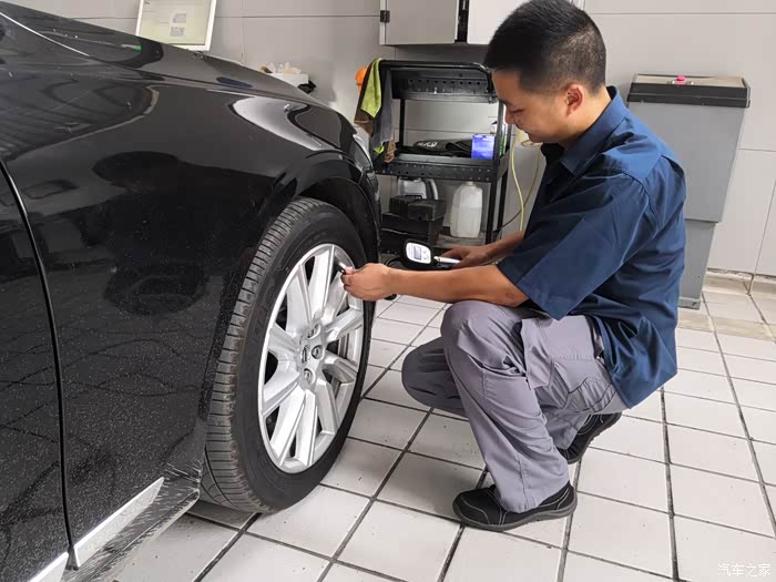 临行前再次检查胎压 ,确保行车安全