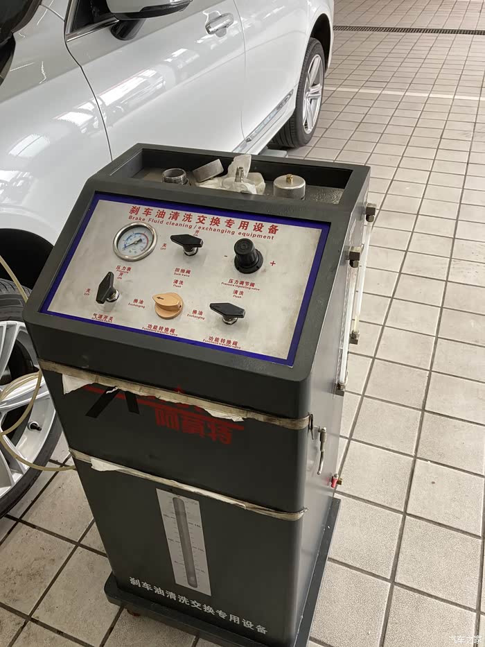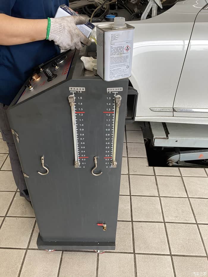 后面是更换刹车油,设备挺专业,以前的车都是土方法--重力换油。