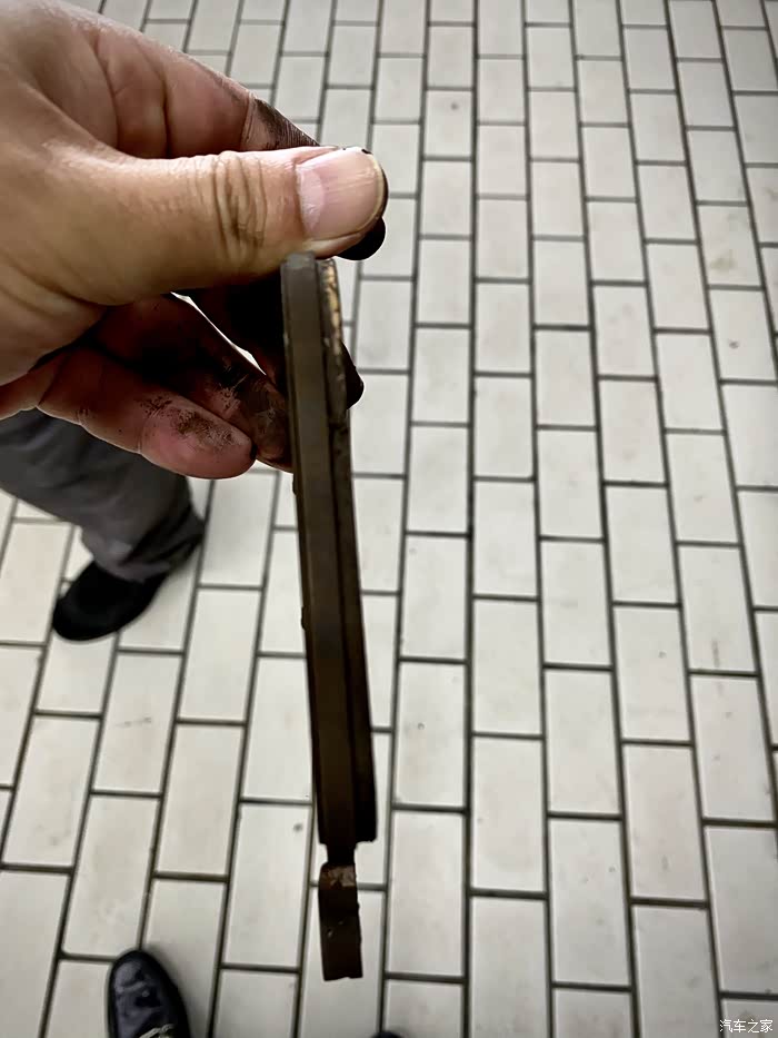 这边的磨损不太均匀,师傅解释说一般外侧的刹车片磨损较严重,并且整车七成左右的刹车力在前轮,这个正常
