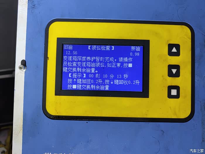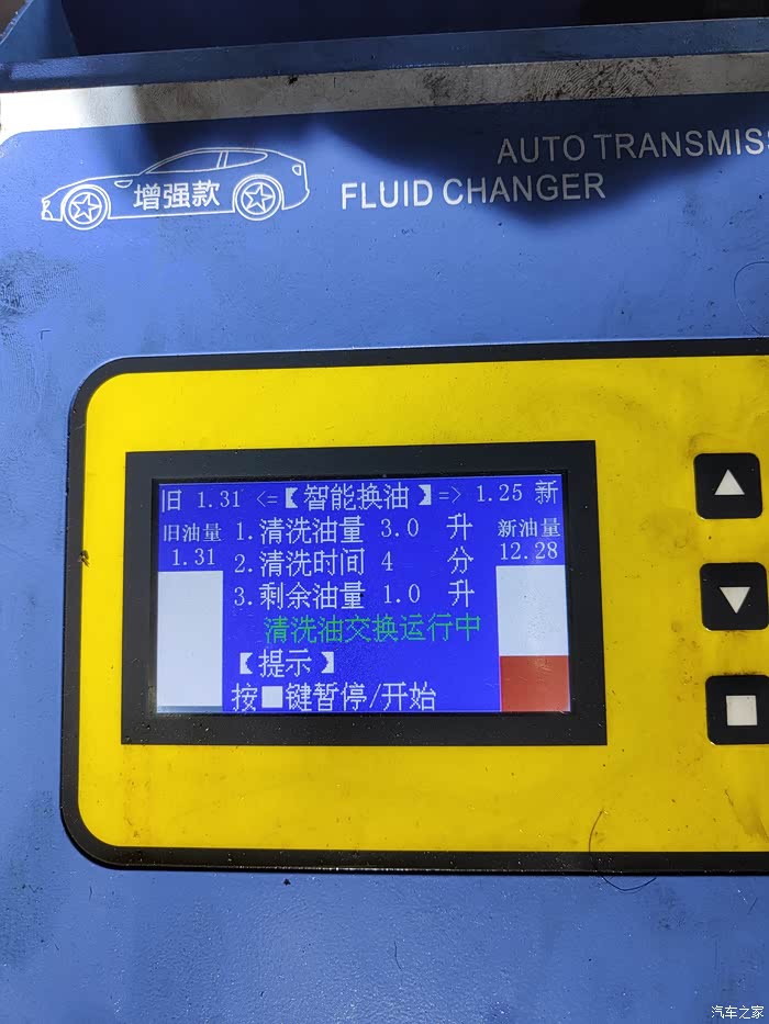 七、等量换油,最后留出一升油封口用。取保变速箱里面的油是加满的,所以大家循环机换油的时候,最好买13-14升,这样比较彻底,反正工时费都是一样的。多1-2升油贵不到哪里。