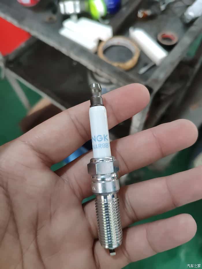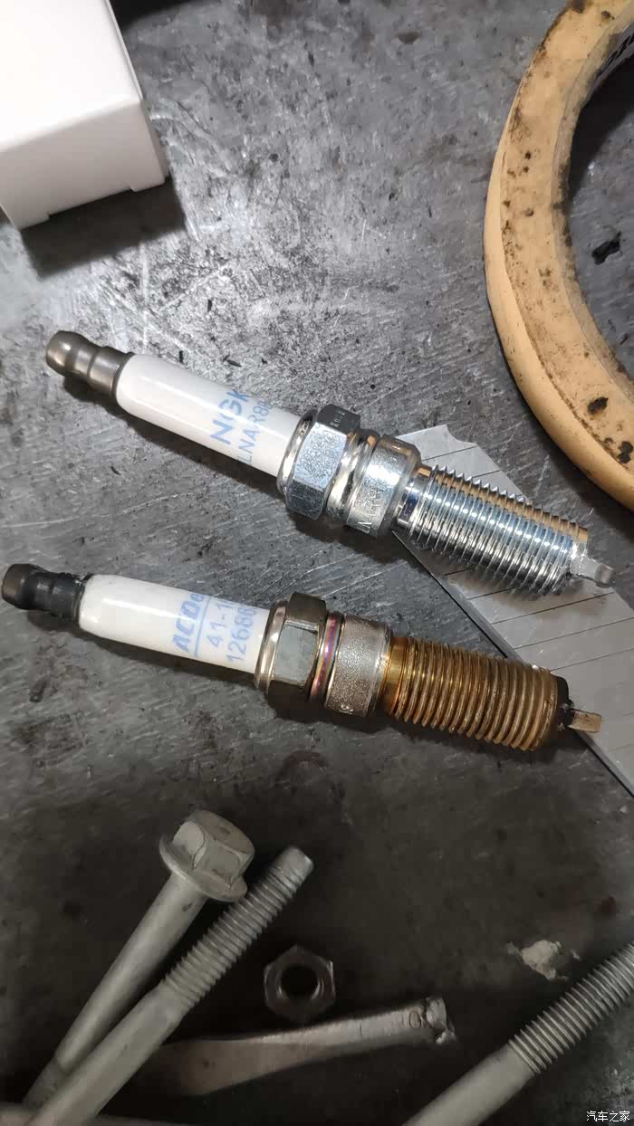 左边是原厂火花塞,右边是新的火花塞。友情提示,不要手贱去摸刚拿出来的火花塞