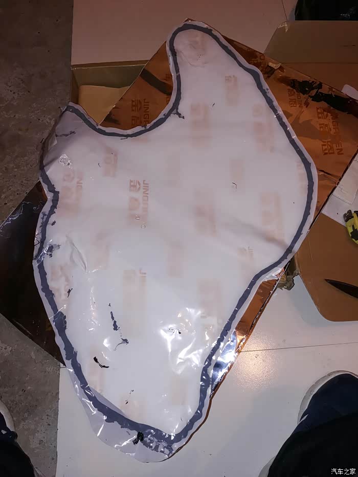 7、前面撕下来的防水膜派上用场了,按照模型尽量大的去裁剪止震板。(线路孔位也要开好)