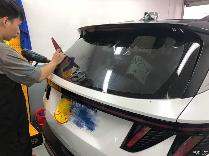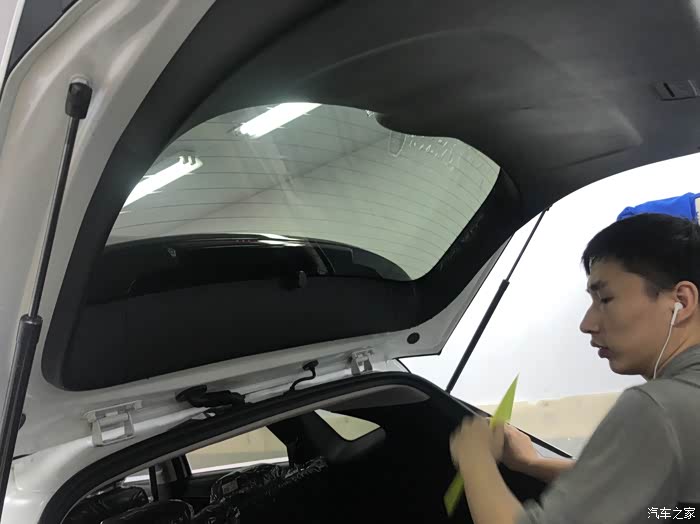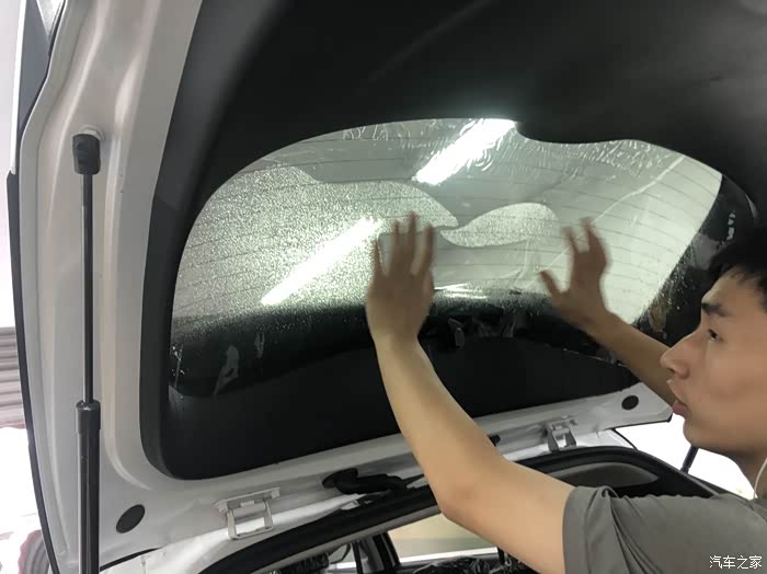 贴完外面的膜,我以为完工了,没想到外面贴的膜只是作为定型,真正要贴的地方其实是车内,定型完,是要拿到车内贴的,拿到车内重复刚才的动作。