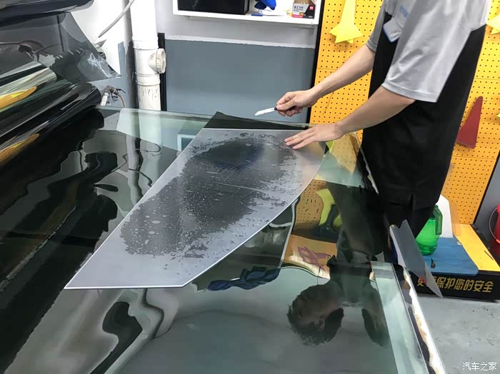 擦干净以后,就用刚才在挡风玻璃上面定型完的膜进行贴膜,配合烘枪和刮板进行重复的安装。
