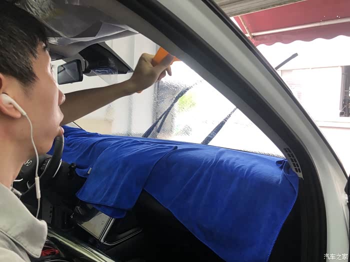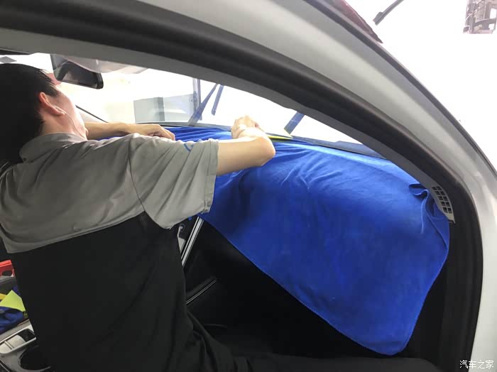 前排和侧边玻璃由于是车内施工,需要铺设干净的毛巾。
