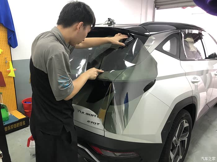 前档我感觉难度最高,因为窗户比较大,师傅中间部分贴膜还是有一点难度的。需要站在车上。