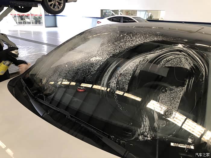 然后用特殊的去油垢的清洗剂给我清洗一下汽车玻璃。