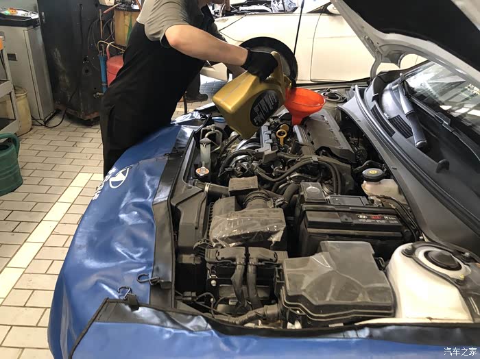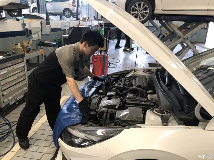 然后保养师傅打开引擎盖,铺好防护垫,开始劳作
