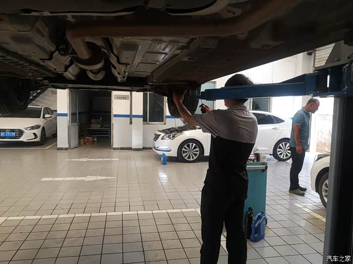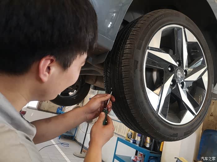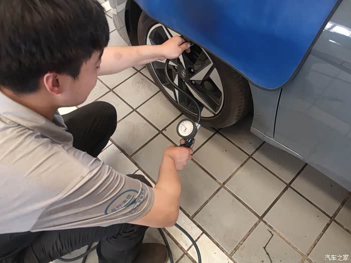 最后每个轮胎都测一下胎压,师傅说出厂时胎压比较大,保养的时候统一调到2.5