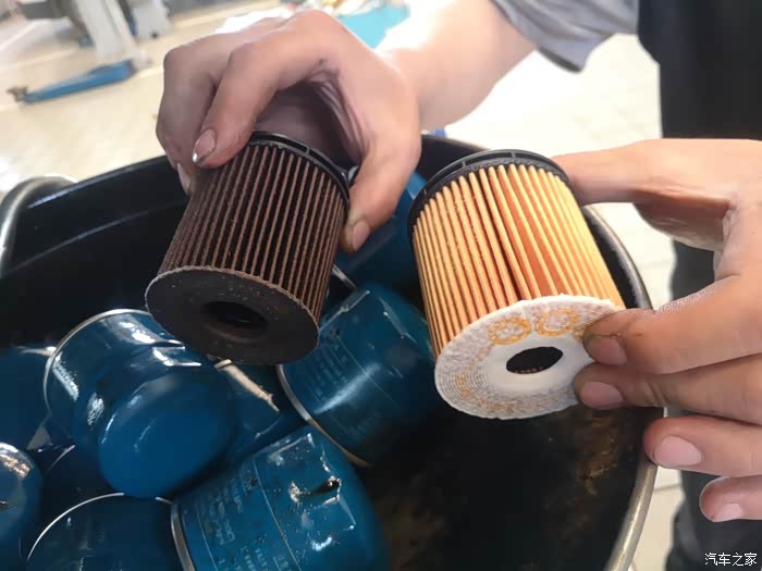 机油滤清器新旧对比,旧滤清器上面有点儿杂质,师傅说没事儿,每个车到保养的时候滤清器都这样