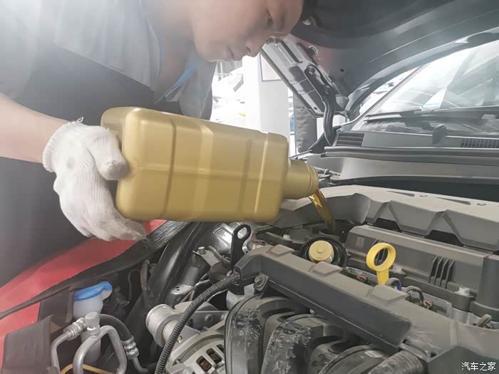 开始加机油,新的是黄色的