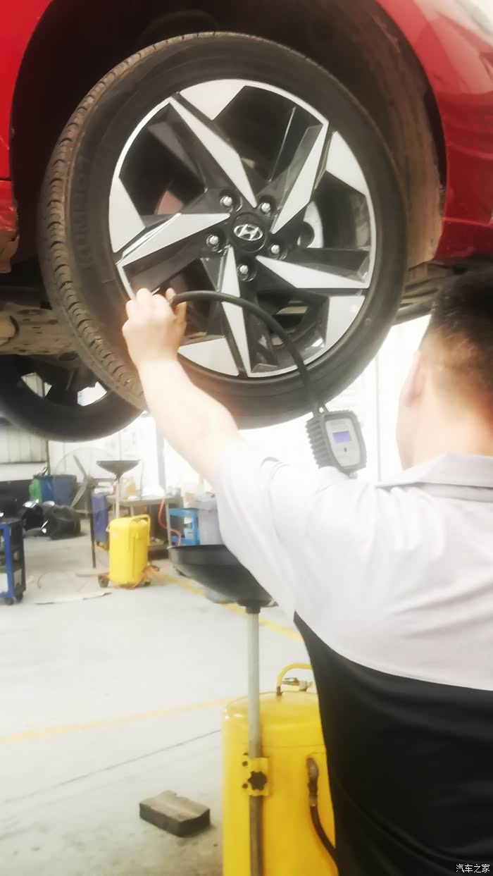 测胎压师傅认真又负责的检验。