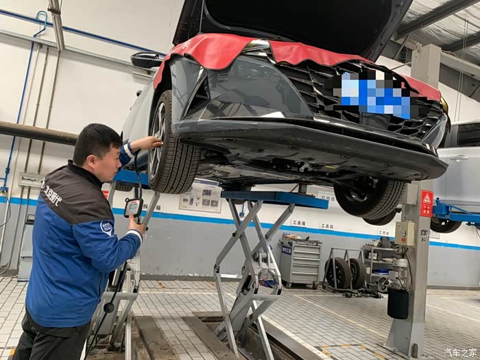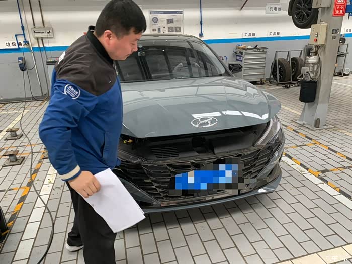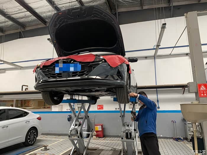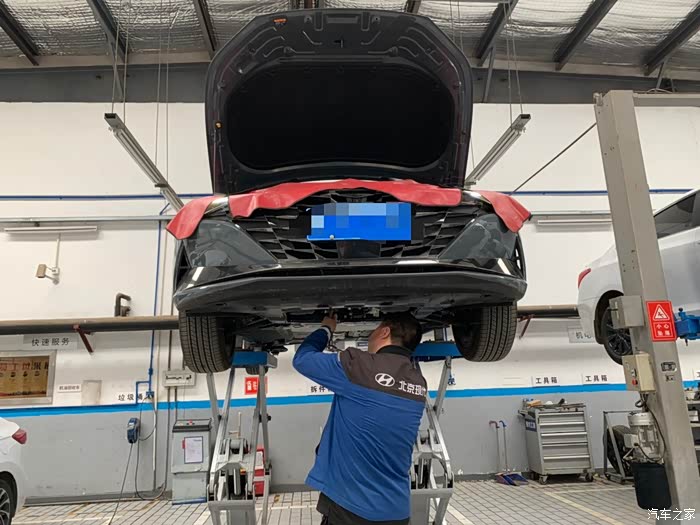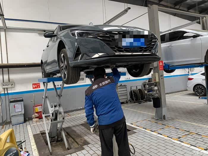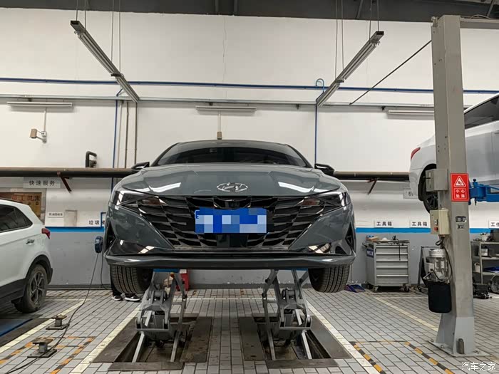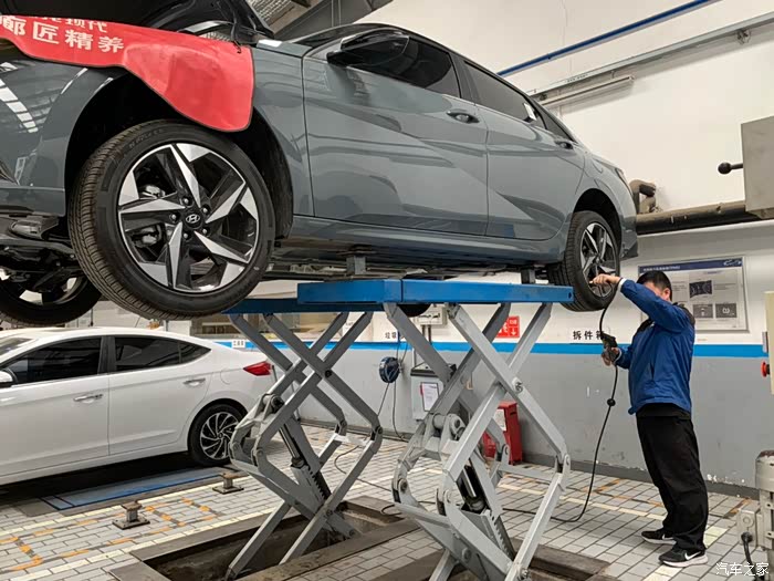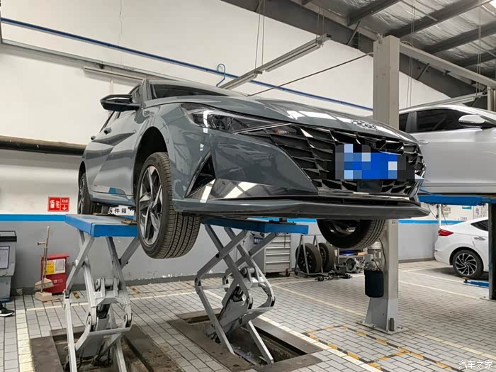第七代伊兰特被这个大架子一下就给架起来了,方便更好的检察车底情况
