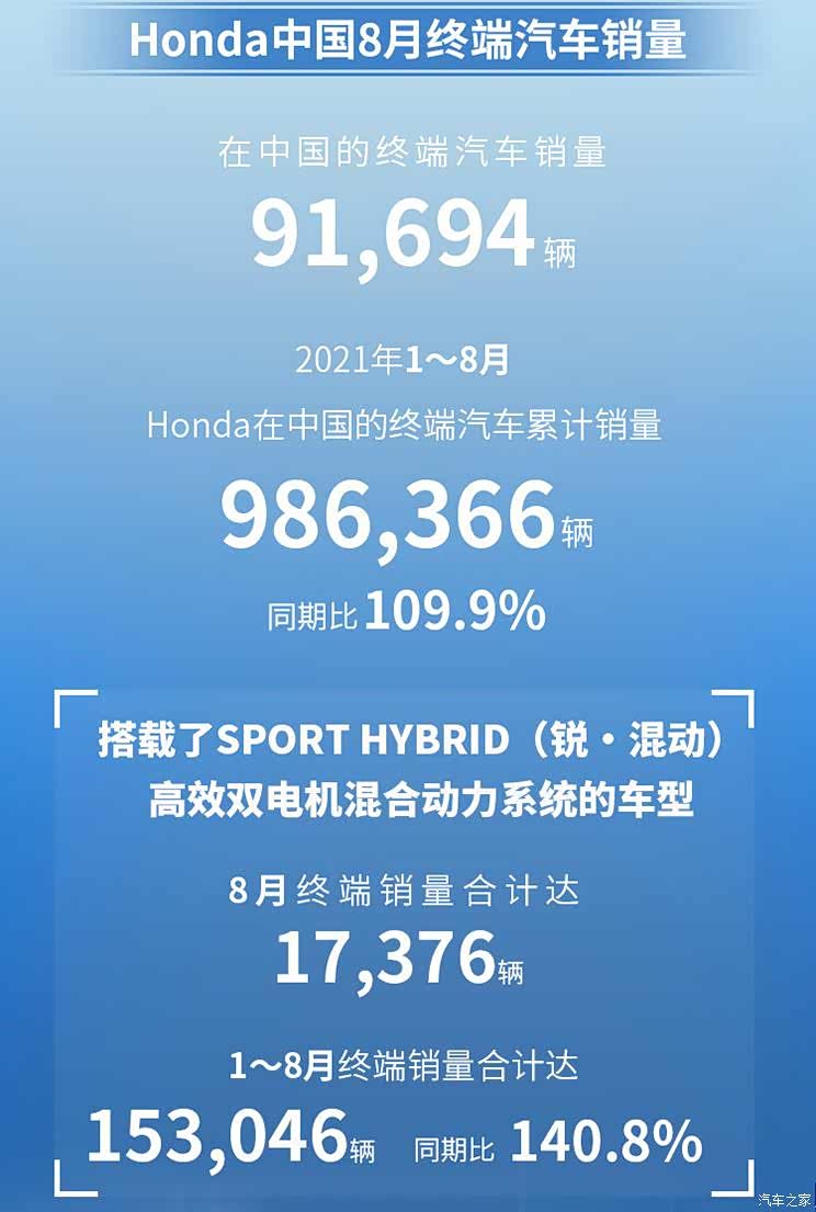 2021年1~8月本田在中国的终端汽车累计销量为986366辆,同期比109.9%。其中,搭载了SPORTHYBRID(锐·混动)高效双电机混合动力系统的车型2021年1~8月终端销量合计达153046辆,同期比140.8%。