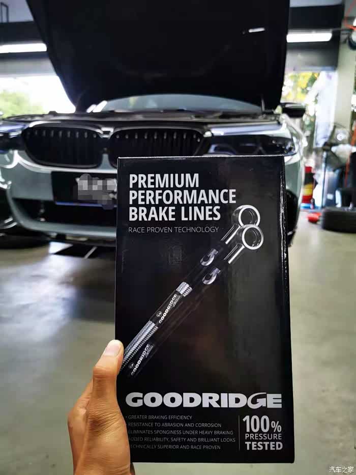 Goodridge的刹车钢喉,宝马原厂的刹车套装是不带刹车钢喉的,既然刹车都换了,就顺便把钢喉也升级一下,别说我刹车钢喉一起上会体验不出钢喉的用处,因为我上一台车改刹车就是 刹车皮--钢喉--刹车盘--AP刹车套装一步一步来的,我也比较敏感,确实钢喉能提升初段的刹车力或者说是脚感吧