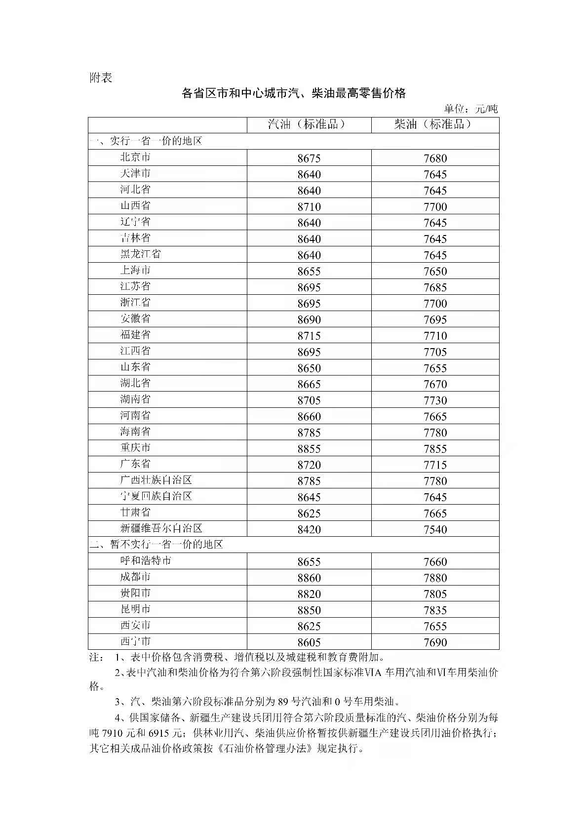 近期国际市场油价变化情况,按照现行成品油价格形成机制,自2021年9月6日24时起,国内汽、柴油价格(标准品,下同)每吨均提高140元。调整后,各省(区、市)和中心城市汽、柴油最高零售价格见附表。相关价格联动及补贴政策按现行规定执行。