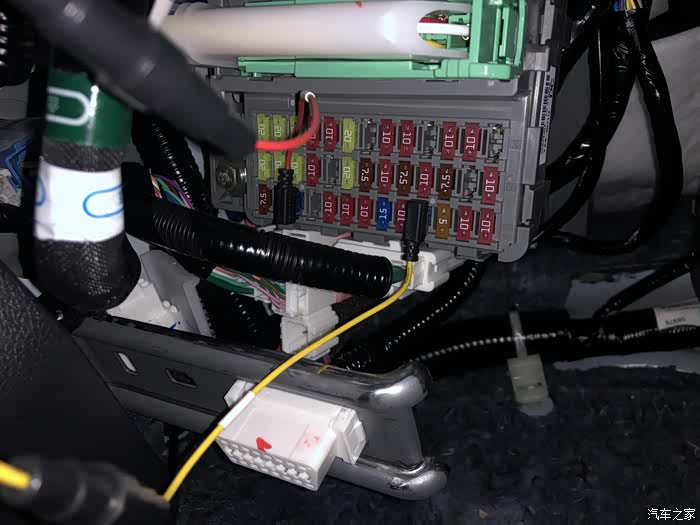 黄线是常电保险,红线是ACC保险。这插保险也有讲究的。要按图中方向插上才有经过保险丝。因为 保险口一端是有电的 ,另一端是没电的。所以线要朝没电这边,这样才经过了保险。反正不懂的照着图插就行了。