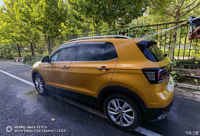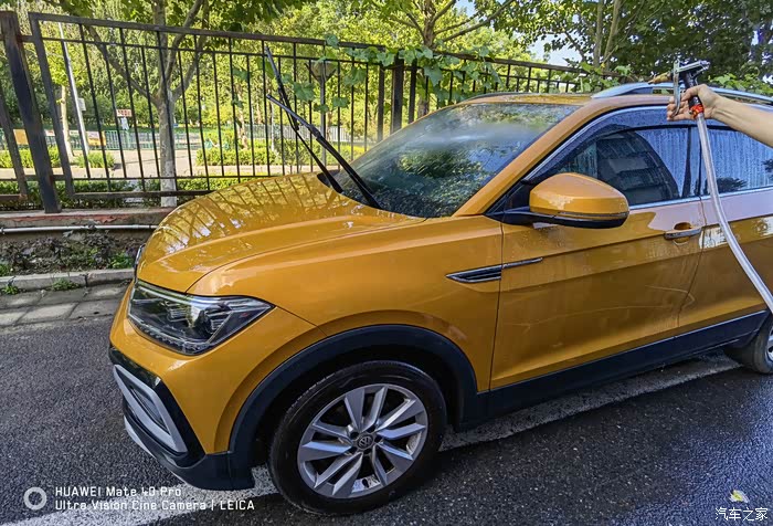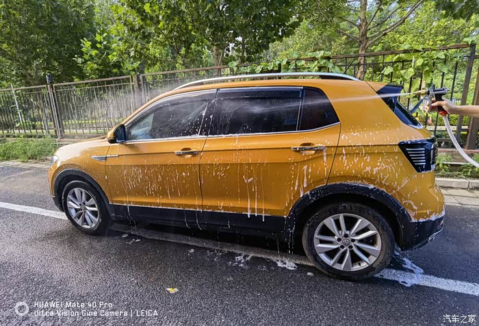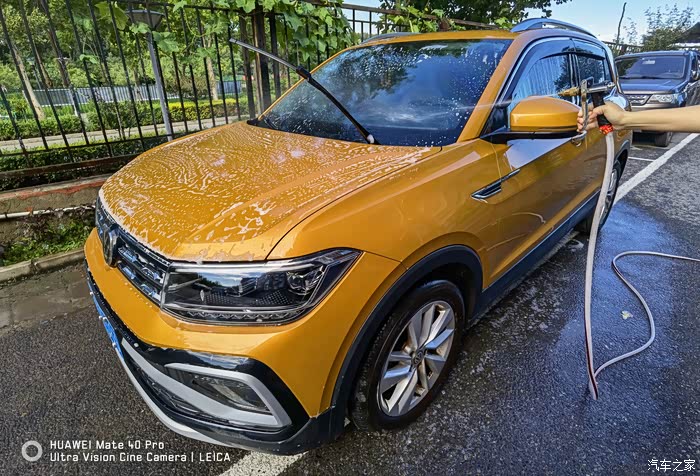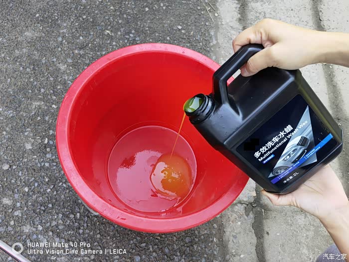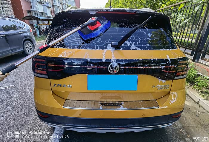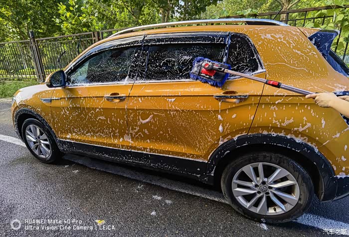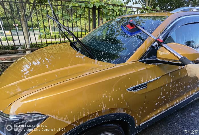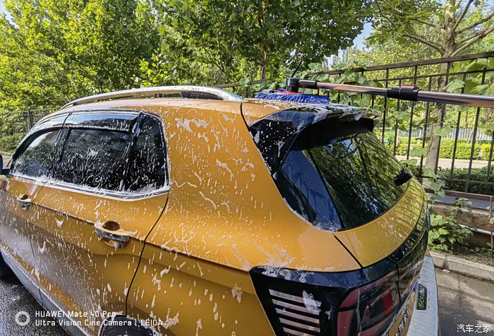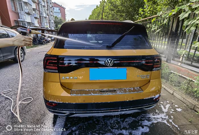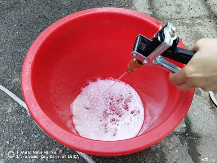 打沫完成再用水枪进行一次彻底的冲洗,主要把车上的泡沫冲洗干净,虽然水蜡是中性的配方,但如果残留有水蜡的话多少对车漆还是会有一些影响。