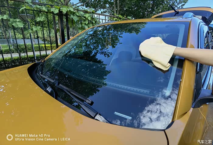 冲洗完成后,用麂皮擦干净车身表面的水分,擦拭的过程中发现使用水蜡的效果就呈现出来,玻璃上的油膜没有了,感觉透亮透亮的,车漆也变得比之前更有光泽。