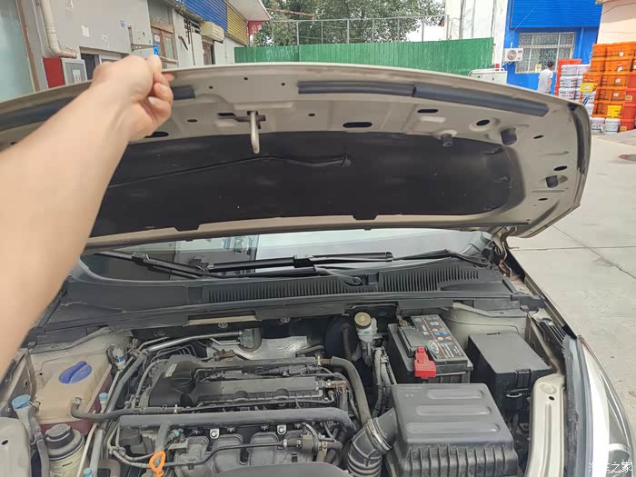 整个发动机舱的布局,中间的是发动机,右侧是电瓶和进气装置,左侧红色则是防冻液壶,小的蓝色盖子的就是玻璃水壶。