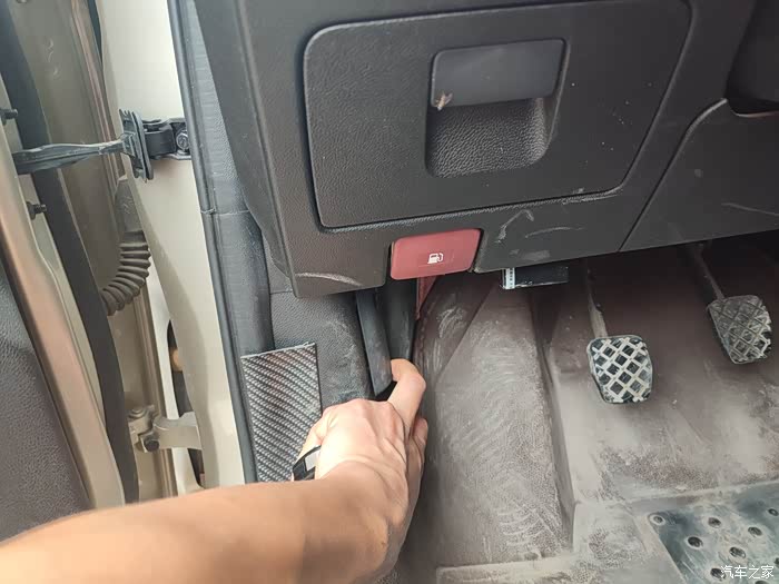 把这个黑色的引擎盖开关往外一拉,就能听到砰的一声,引擎盖的一级开关就打开了。