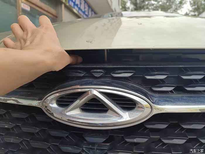 在奇瑞logo的上方,从这个缝隙中我们可以看到有一个黑色的小开关,我们向下一按右手就可以把你应该抬起来。