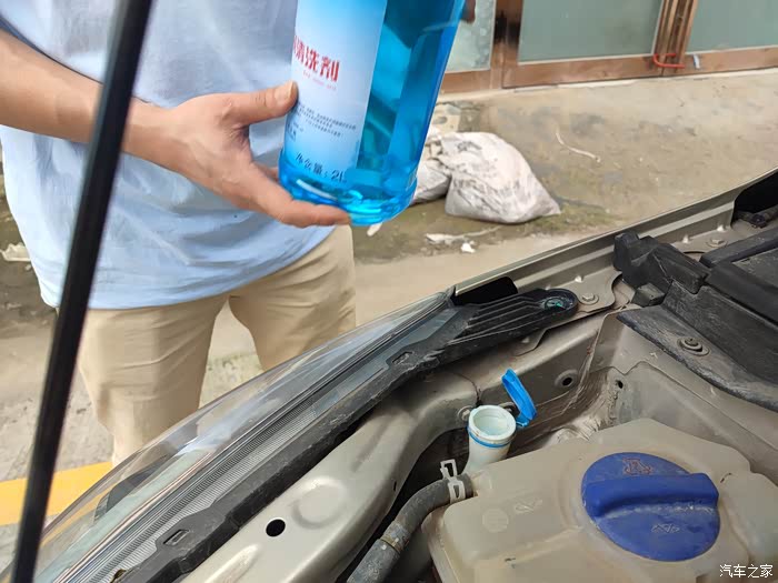 仔细小心地把玻璃水加入玻璃水壶内。