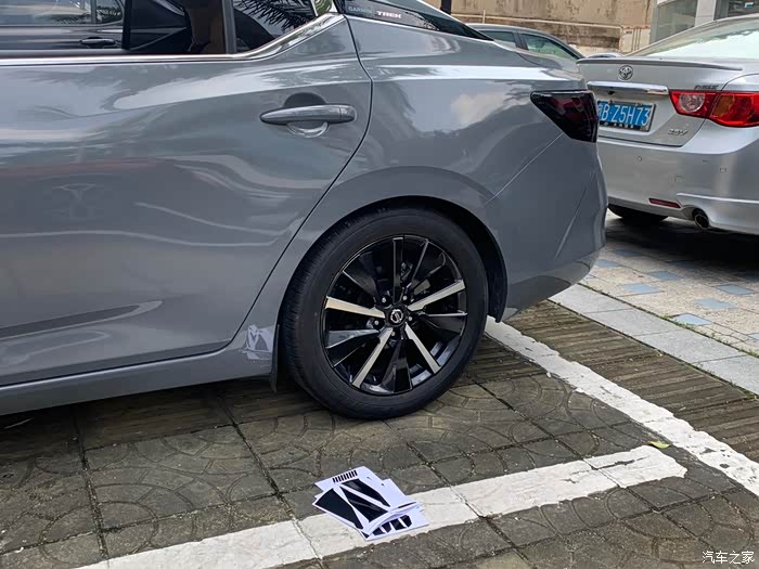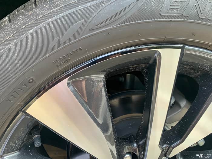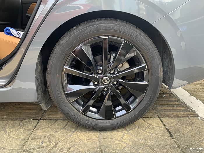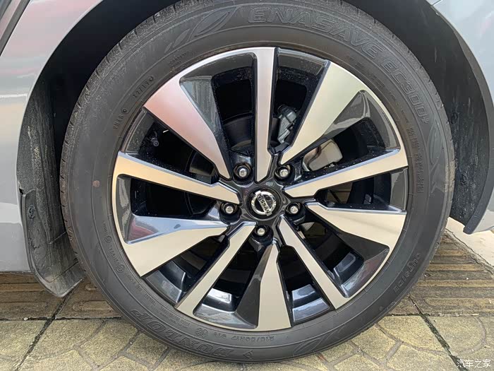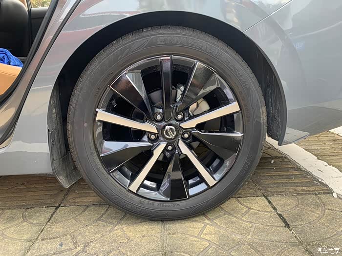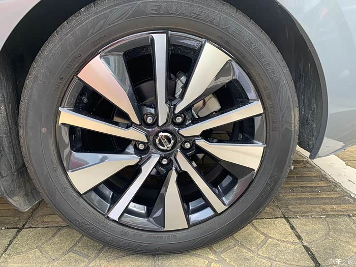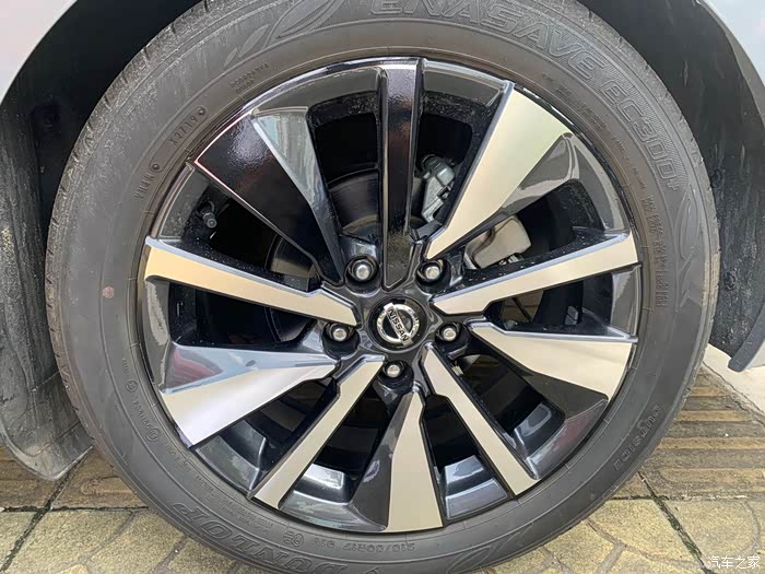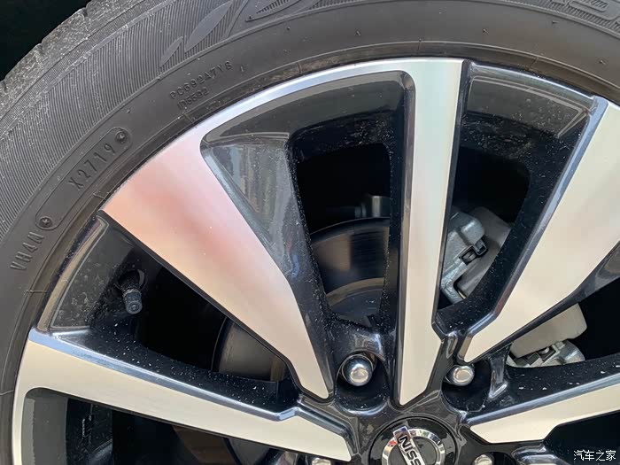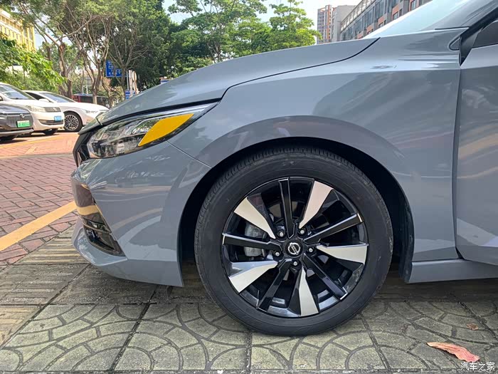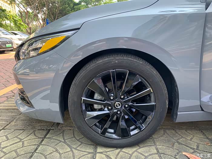 轩逸这套顶配的轮毂是一个像放射辐条的大五辐轮毂,每组由一个粗条、一个细条和一个边缘弧线构成。