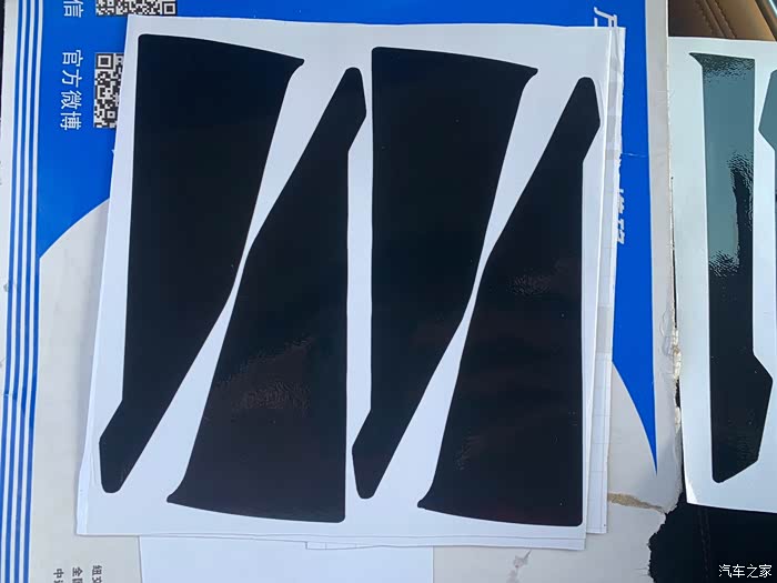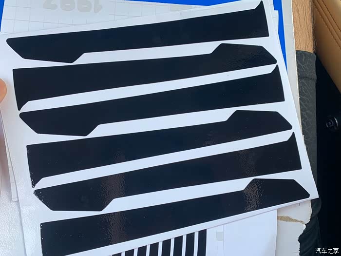 贴纸材质和普通的黑色改色膜差不多,但比较薄,拉伸性还可以,贴纸组包括三个部分,第一个部分是细条