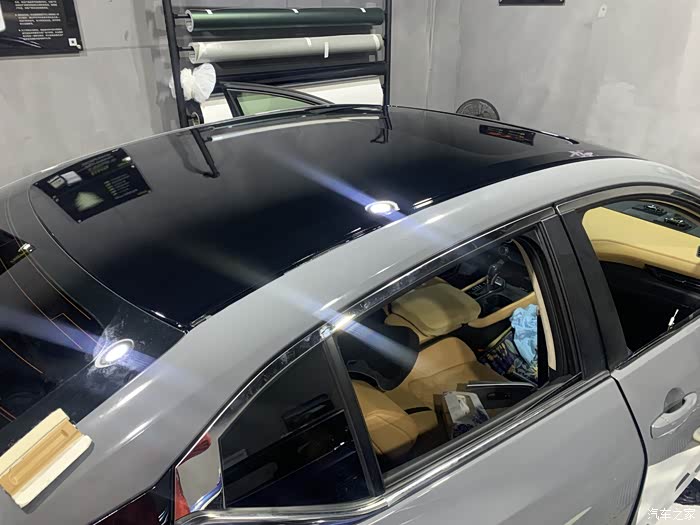车顶的黑膜也贴好了,把保护膜撕下去,很亮。