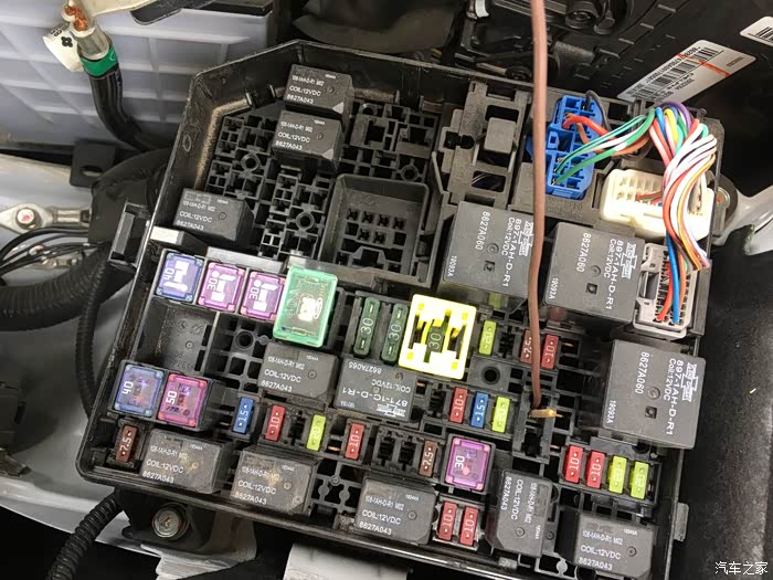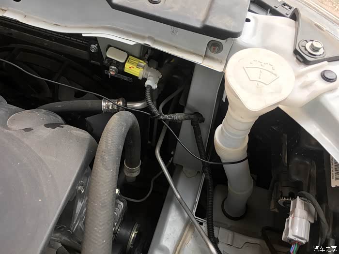 这根线就这样穿越发动机舱。还是有些安全隐患,发动机里的温度太高,这根线能承受吗?所以一定要用大品牌的电线,等老化了要及时更换。