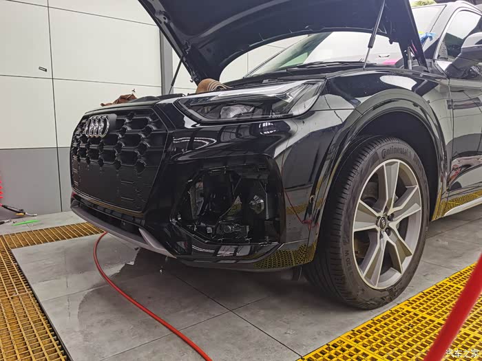 小哥们已经把保险杠拆下来又安上了,此时黑中网已经换上,雾灯框暂时还裸露在外...