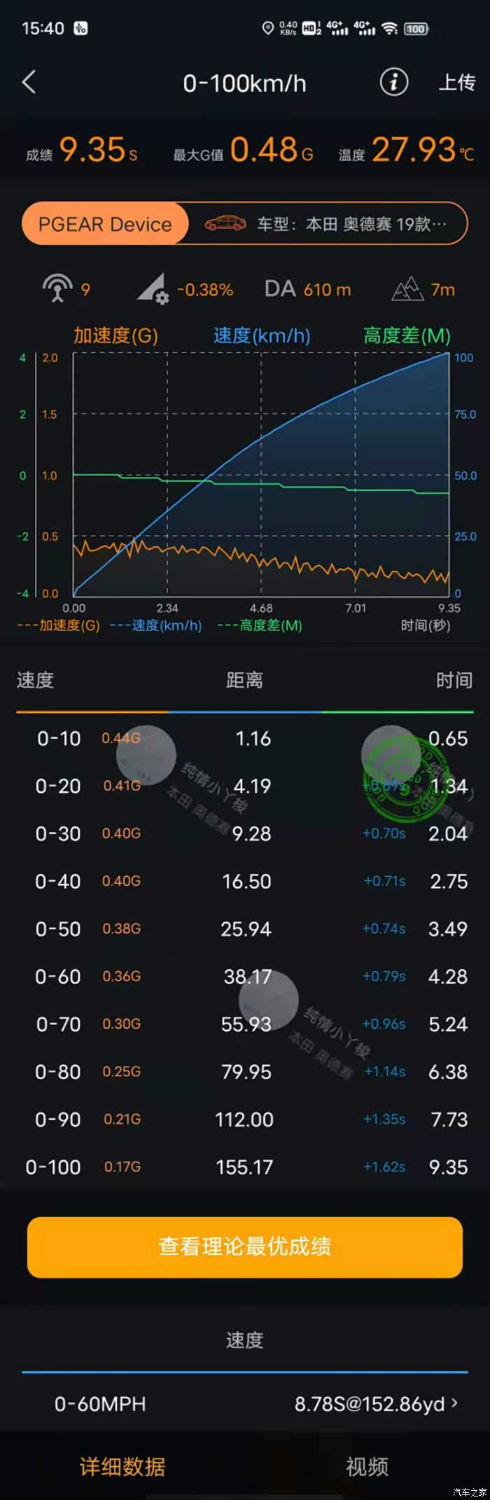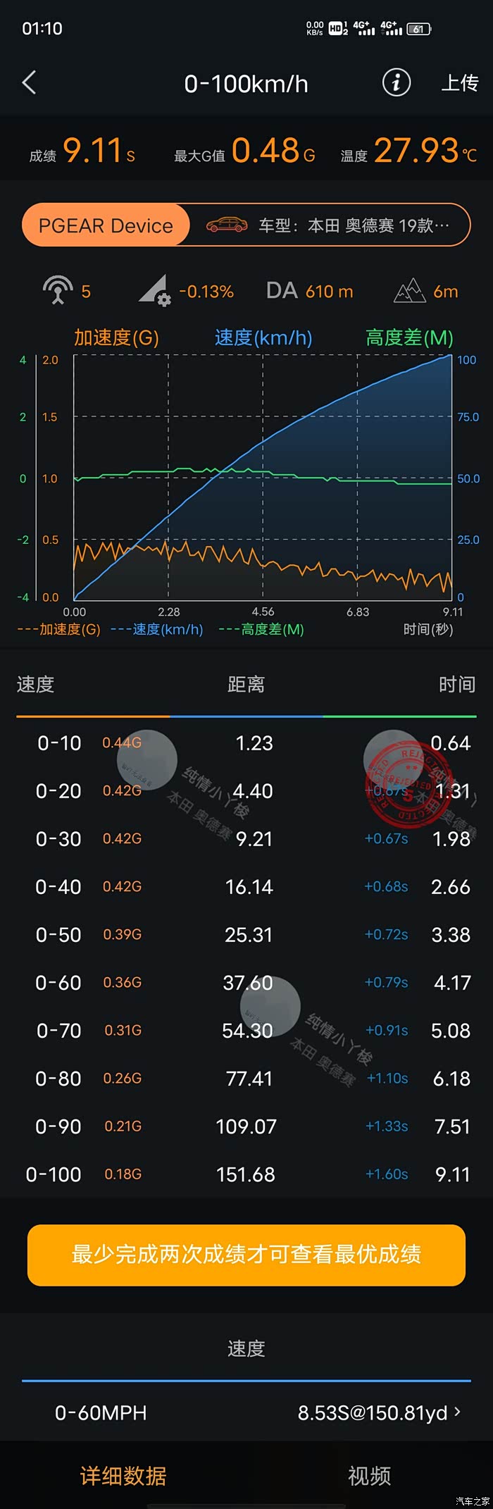 完全无感,无论是从发动机、排气声,还是动力响应上,都没明显的变化。于是找了个夜深人静的偏僻地方做了几次测试。事实证明我的感觉没问题。我先后做了4次测试,S档关闭防滑。第三次测试有点急促所以没有踩着刹车踩油门弹射起步,成绩稍差。